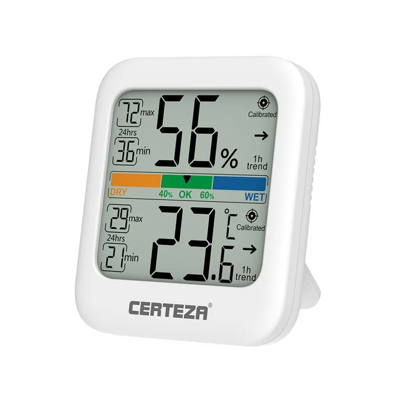 Discover our newly arrived German Hygrometers, designed to give you accurate and effortless indoor climate monitoring. They display real-time temperature and relative humidity, complete with a comfort indicator showing DRY, OK, or WET conditions. Track your environment with 24-hour max/min readings and clear trend arrows for the last hour. With switchable °C/°F units and a handy calibration icon, these hygrometers deliver precision and simplicity in one sleek device.